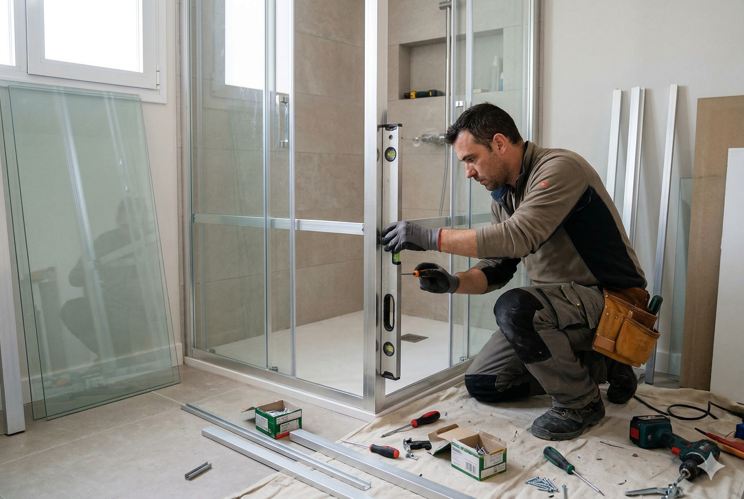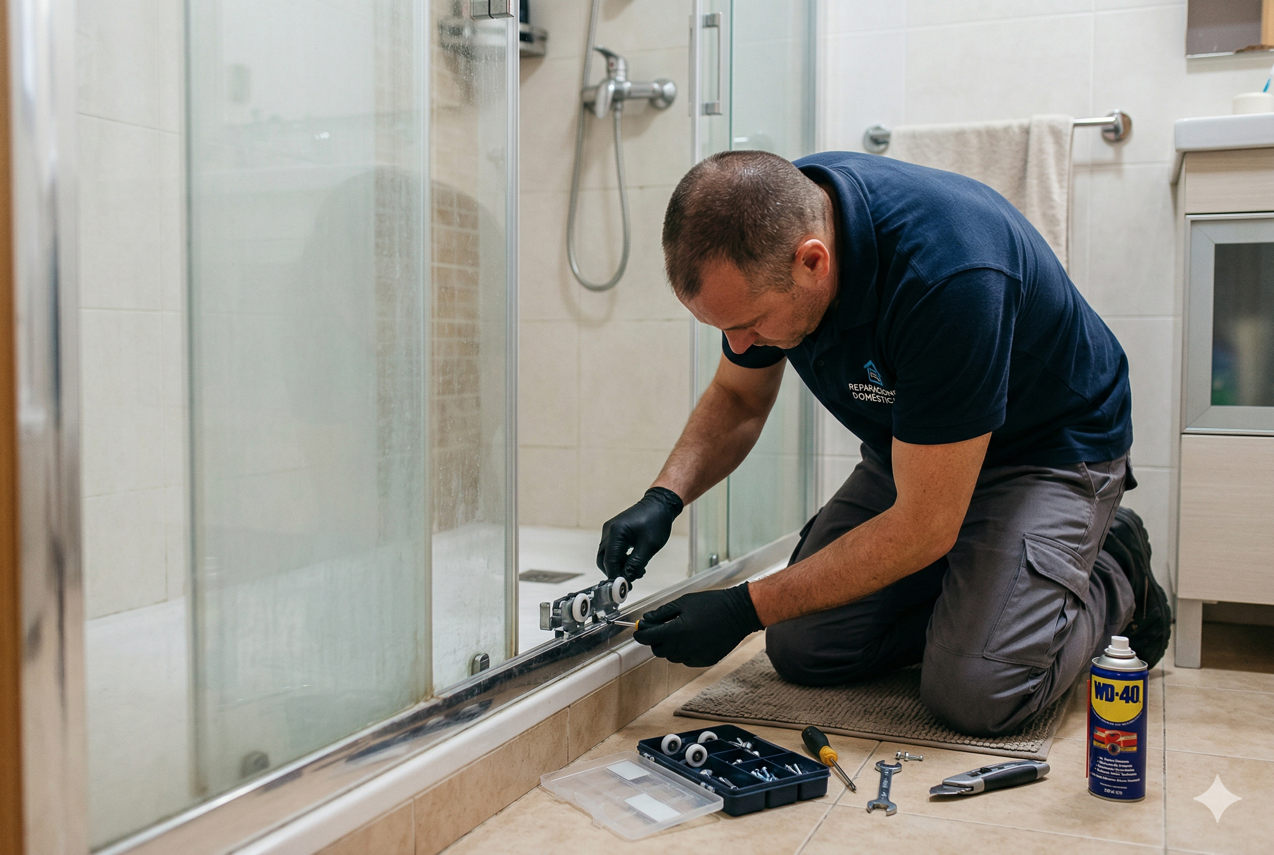Reparación profunda de rodamientos, rieles y cuadratura. Tu mampara volverá a correr suavemente con un solo dedo.